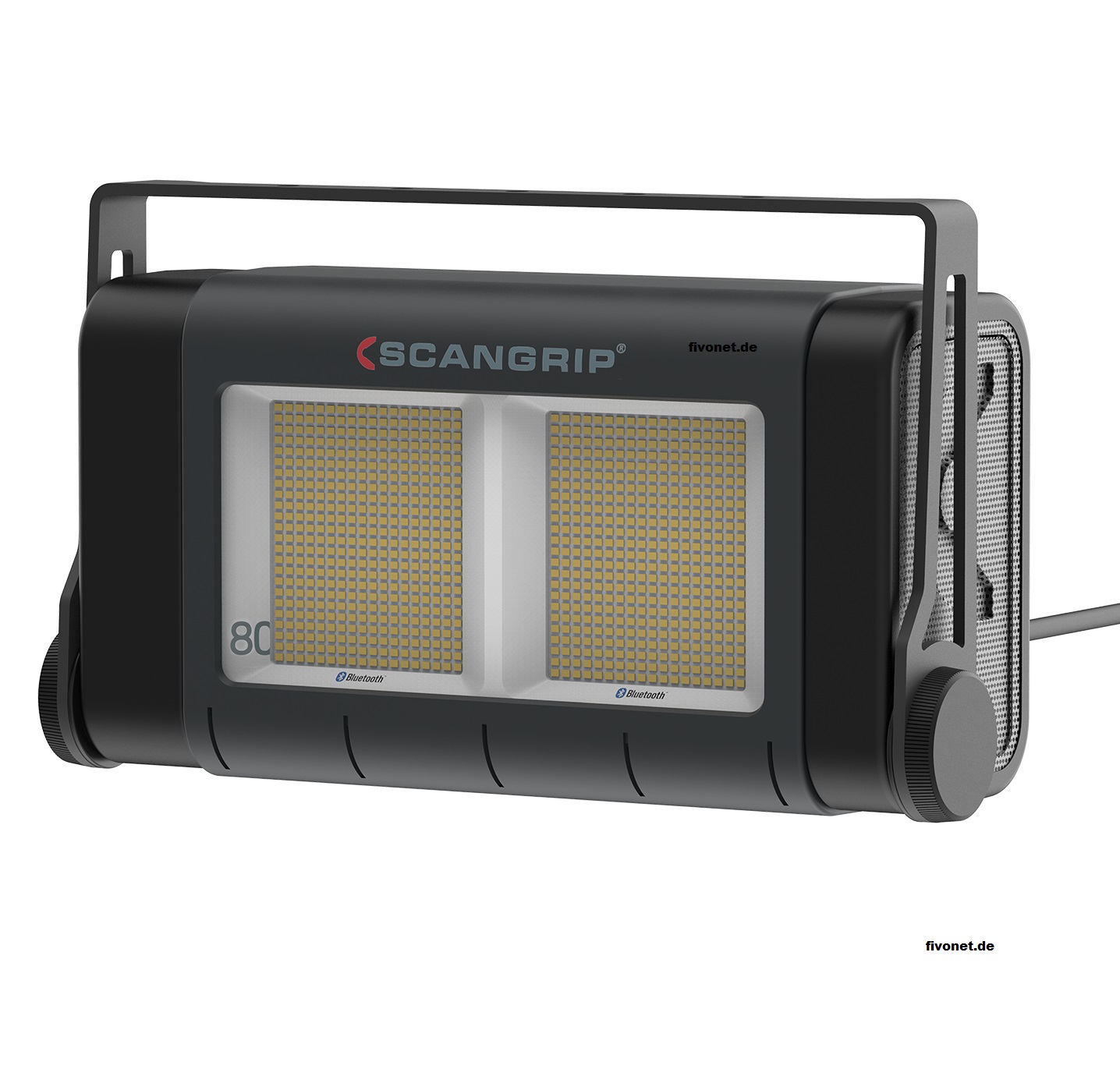 Kompakte Großflächenleuchte von Scangrip mit extrem hoher Lichtleistung und hervorragender Flexibilität hier in 2-facher Ausführung, dem fivonet.de Komplett - Set, mit insgesamt unglaublichen 160.000 Lumen / Lichstrom. Mit der modernsten LED Technologie leistet die SITE LIGHT 80 bis zu 80.000 Lumen und einen breiten 120°- Abstrahlwinkel für superhelle Ausleuchtung von großen Arbeitsflächen. SITE LIGHT 80 wird mit einer Dimmfunktion geliefert und die BLUETOOTH Lichtsteuerung ermöglicht mit Ihrem Handy das Ein-/Ausschalten der Arbeitsleuchte und die Lichtleistung in vier Stufen anzupassen. Wenn die Arbeitsleuchte an einem Stativ oder hohen Mast montiert ist, reduziert diese Funktion den Stromverbrauch, weil man nur die notwendige Lichtmenge für die Aufgabe verwendet. Die Arbeitsleuchte ist mit einem integrierten Tragegriff leicht und bequem zu transportieren und sehr einfach auf einem Stativ oder Mast zu montieren. Mit nur 6,7 kg ist SITE LIGHT 80 sehr kompakt und leicht im Vergleich zu anderen Lösungen auf dem Markt und dabei ist die Montage der Leuchte bequemer und sicherer. Die Doppelhalterung für die Montage von zwei SITE LIGHT 80 - Leuchten ist in diesem Komplett Set natürlich enthalten.
