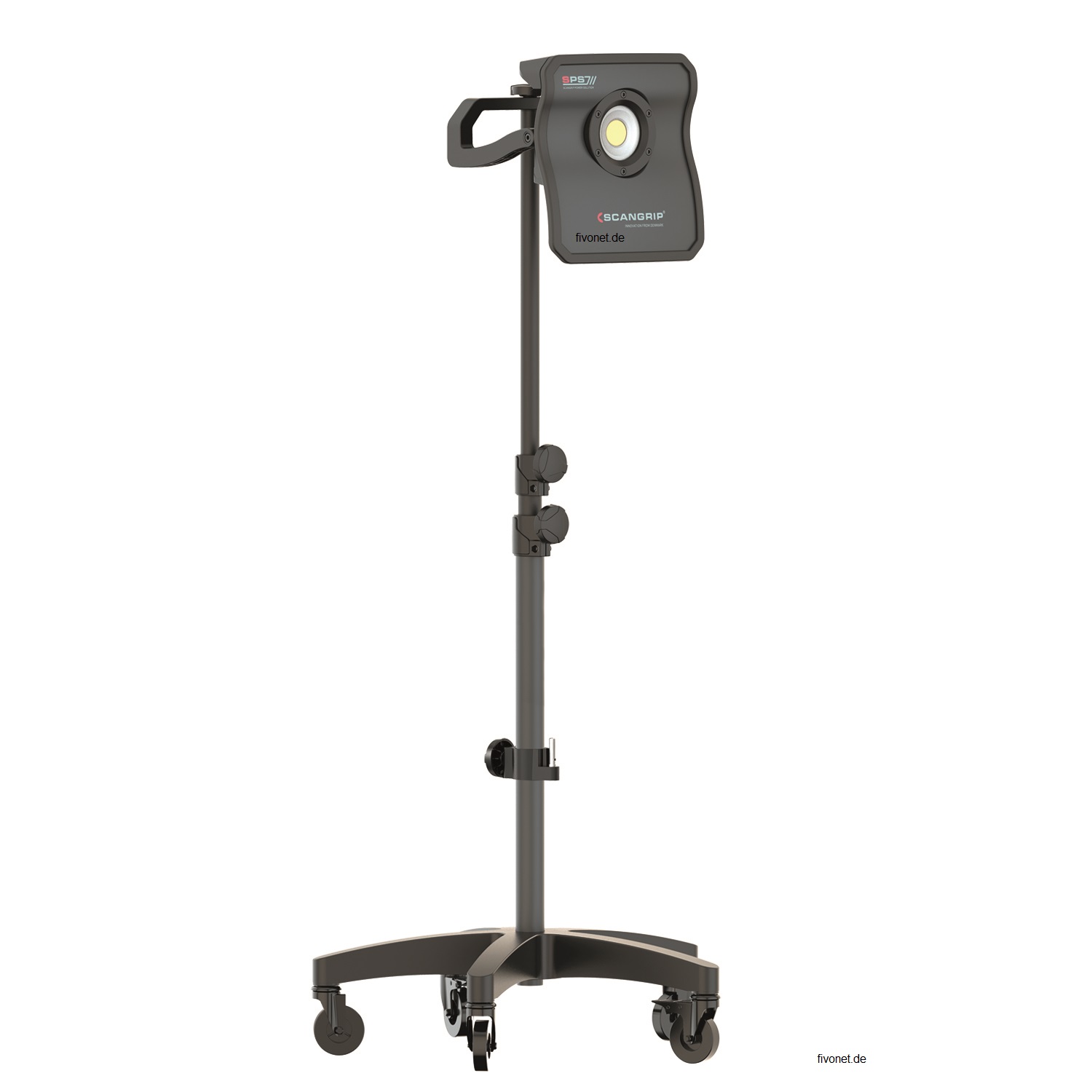 Scangrip Rollstativ in verbesserter Ausführung jetzt mit 5 Rädern. Das fahrbare Stativ ist von 0,9 - 1,9 Meter verstellbar und lässt sich hervorragend bewegen. 2 der 5 Räder sind feststellbar. Die Stativrohre bestehen aus kräftigem, pulverbeschichtetem Stahl, das Unterteil ist aus einem stabilen Kunststoff hergestellt. Der Aufbau beansprucht ca. 3 Minuten und geht relativ einfach. Zuerst die 5 Räder in das Sternunterteil stecken. Anschließend das stärkste Rohr mit dem Konus nach unten einstecken. Jetzt die neu entwickelte Halterung, welche zur Aufnahme einer weiteren Arbeitsleuchte im unteren Bereich gedacht ist, aufstecken. Danach die beiden Rohre mit den Klemmhaltern nach unten zusammenfügen und diese jeweils mit einem 5mm Sechskantschlüssel (nicht im Lieferumfang enthalten) fest ziehen, fertig. Jetzt einfach das oberste Feststellrad heraus drehen, den Doppelbeschlag mit den Handrädern nach unten zeigend aufsetzen und festschrauben, Bügel der Lampen 90° aufklappen und von unten an den Halter schrauben. Das Stativ kann nach Bedarf natürlich auch mit einer NOVA verwendet werden, hierbei wird der Doppelbeschlag nicht benötigt, die Leuchte wird dann direkt auf das Stativ montiert. Die Arbeitsleuchte kann bei Bedarf im unteren Bereich einfach mit dem Bügel auf die Halterung gesetzt werden. Abschließend noch die jeweilige Höhe für die Beleuchtung einstellen, nun kann optimale Leistung bei optimalen Lichtverhältnissen erzielt werden. fivonet.deText