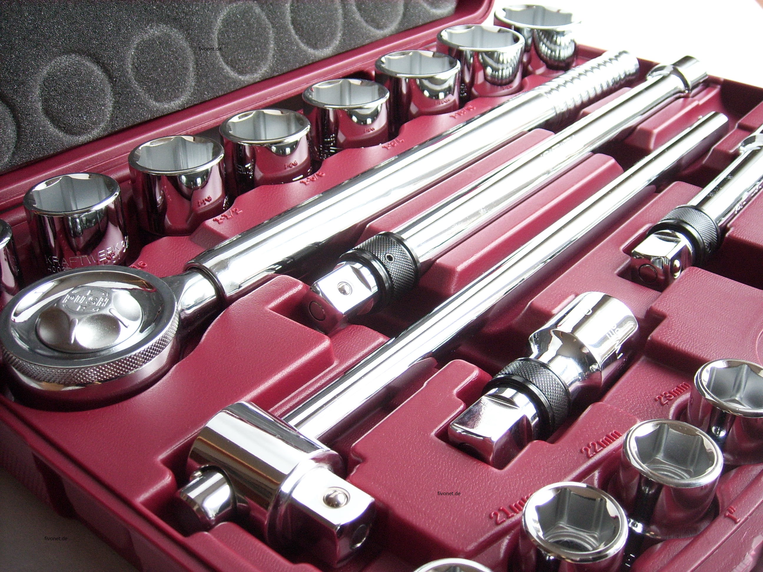 Die 16 Stecknüsse sind von 19 - 50mm übersichtlich im Koffer angeordnet. Die Verlängerungen sind mit einem Verriegelungssystem ausgestattet.