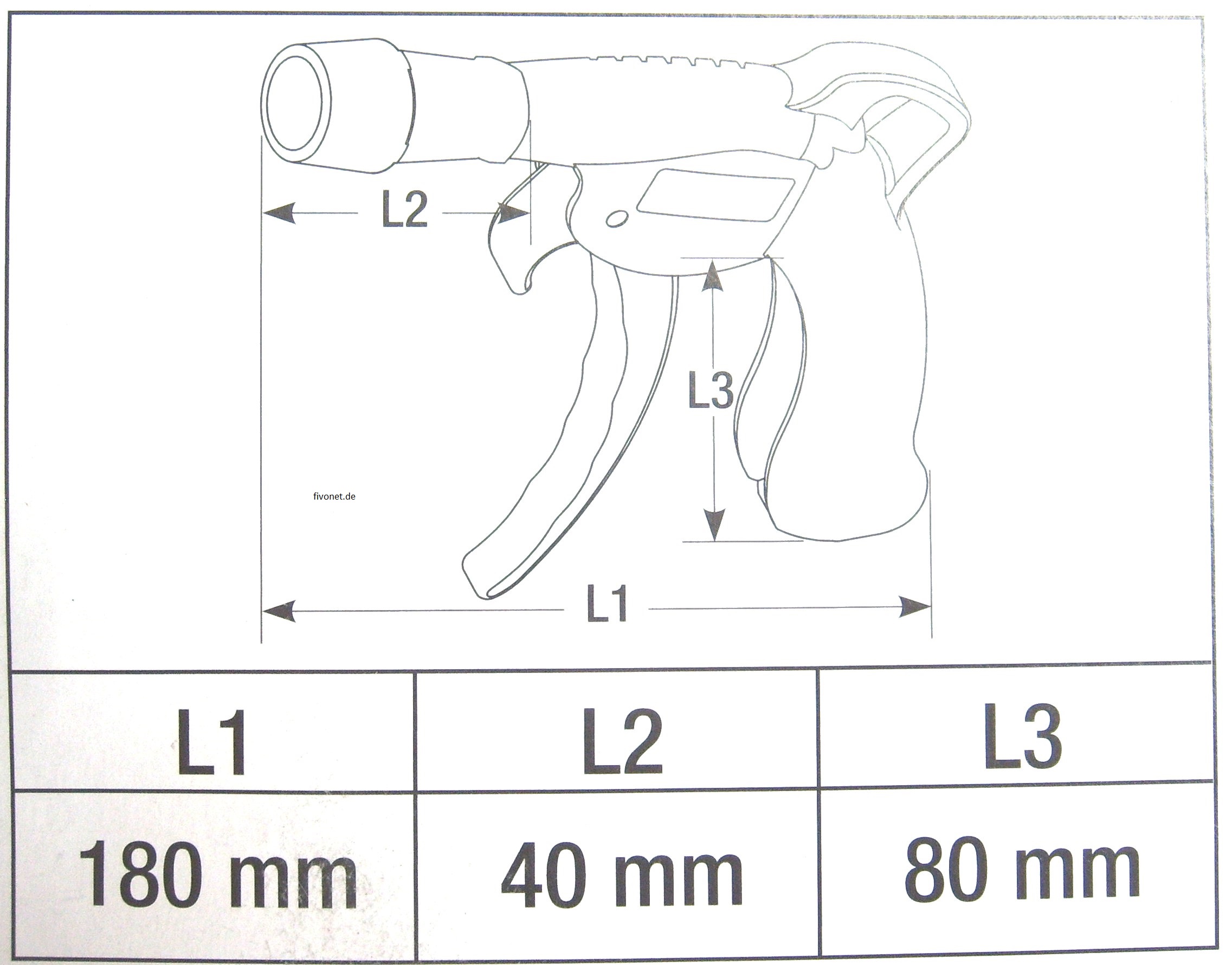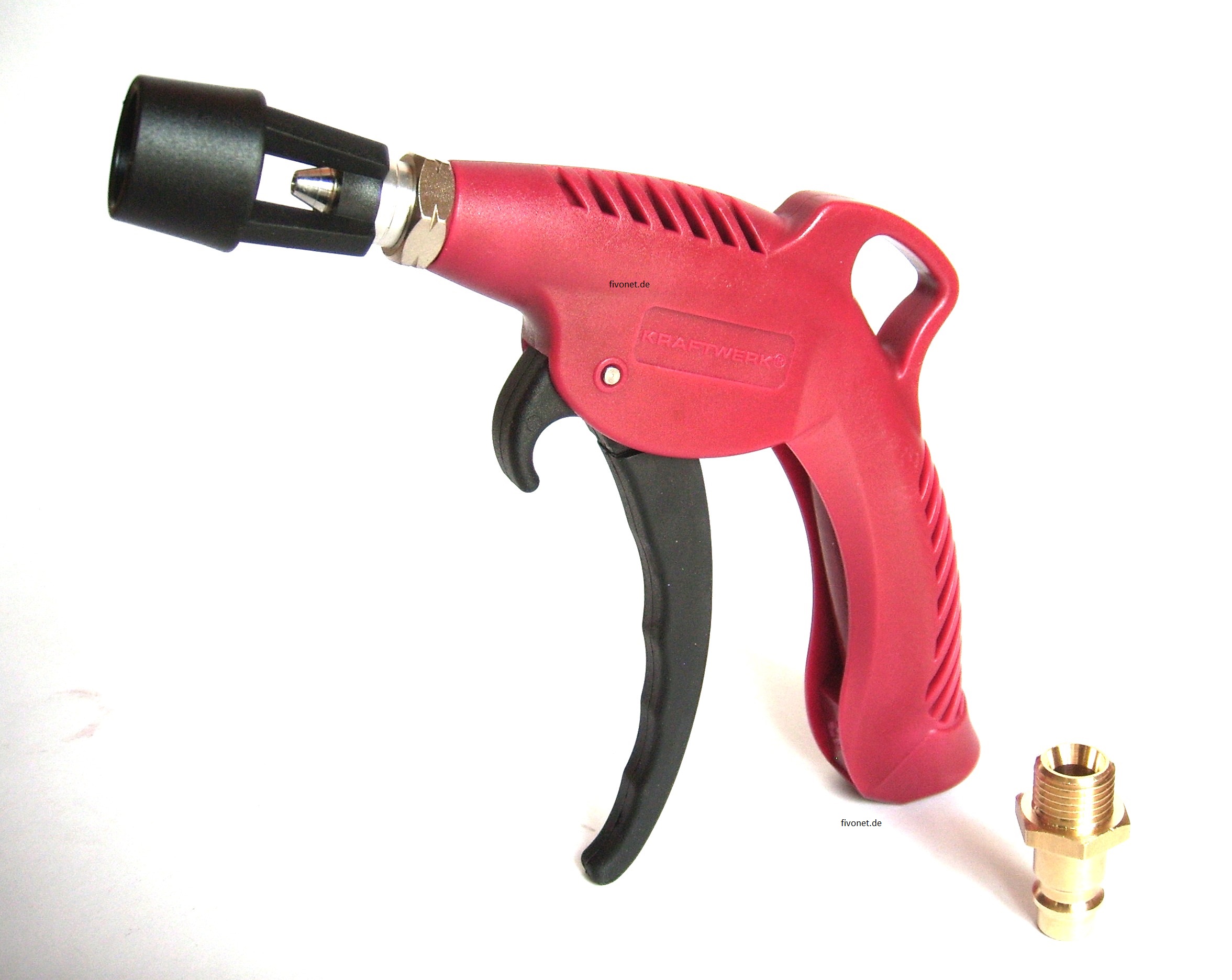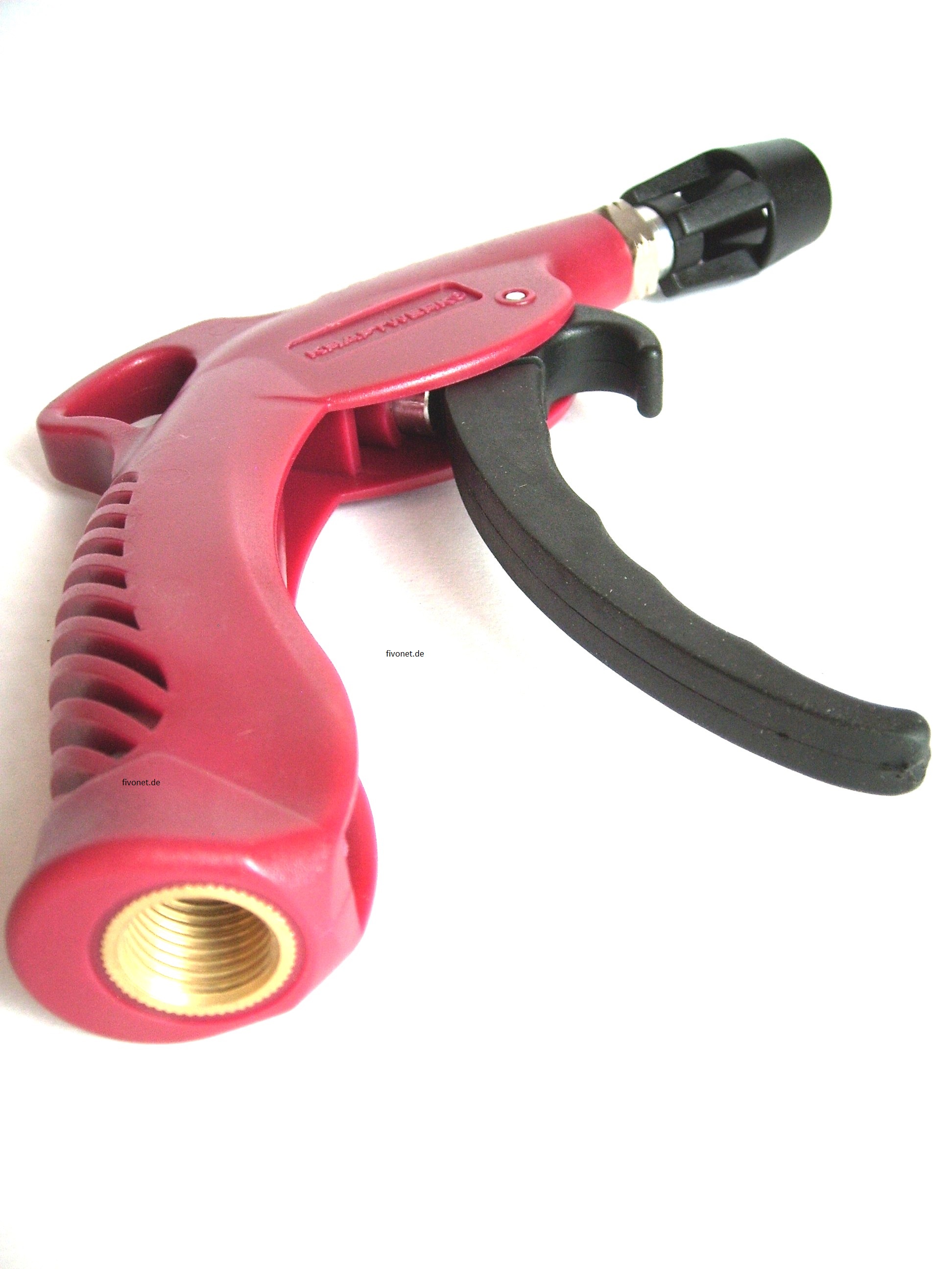 Profi- Druckluft Ausblaspistole mit Turbo-Power-Düse für 4x stärkeren Luftstrahl. Im fivonet.de - Test bedienten wir eine sehr handliche Pistole mit großem Hebel zur perfekten stufenlosen Dosierung mit 4 Finger-Griff. Schon bei der ersten Bedienung ist hier die Qualität dieses Werkzeugs zu spüren. Die 120g leichte Druckluftpistole mit ihrem starken Kunststoffkörper öffnet und schließt, gemessen am Ende des Auslösehebels, im Bereich von 3cm. Da es verschiedene Anschlussmöglichkeiten gibt, wird die Power-Pistole werksseitig mit einem 1/4" Innengewinde geliefert, welches sich an der Unterseite des Handgriffs befindet. Einen Messing Anschlussadapter 1/4" x Stecktülle Druckluft, gibt es nur bei fivonet.de Gratis, lose dazu. Dieser muss vor Verwendung natürlich fachgerecht eingedichtet werden.
