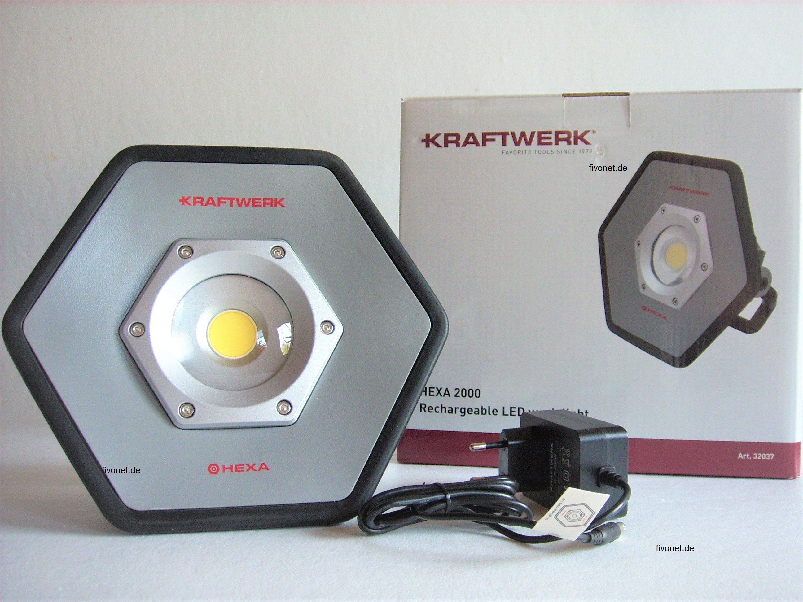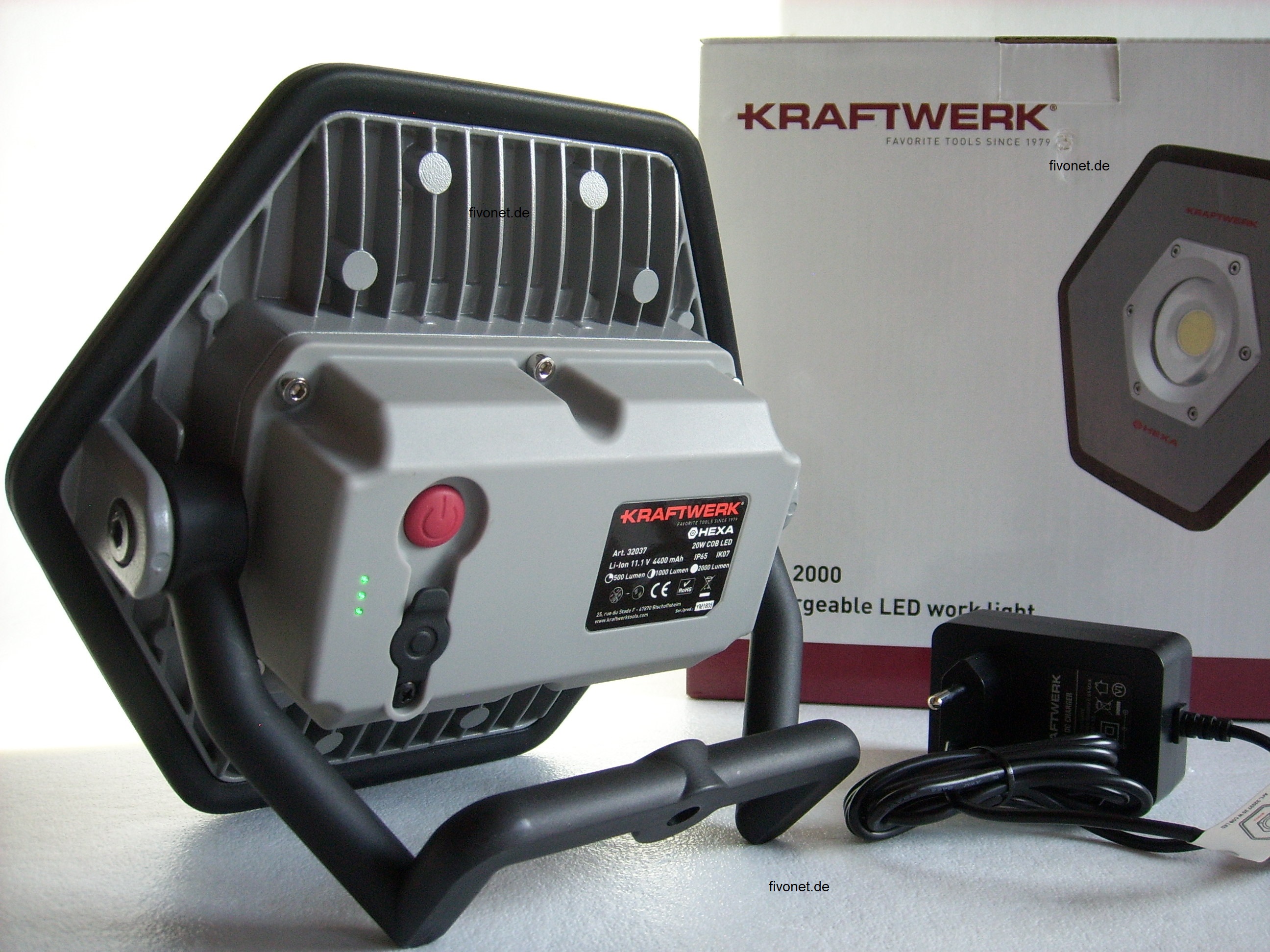 Die moderne 20W COB Arbeitsleuchte HEXA von KRAFTWERK produziert eine überragende Leuchtkraft mit einem breiten Abstrahlwinkel von 120°. Der Strahler ist äußerst energiesparend und mit einer 3-Stufen- Technologie ausgestattet. Der starke 11,1V Lithium-Ionen - Akku lässt die HEXA im Voll-Power-Modus mit 2000 Lumen ca. 2,5 Stunden und in der Mittelstufe mit 1000 Lumen 5 Stunden leuchten, in der abgeschwächten Stufe werden 25% der Leuchtkraft (500Lumen) produziert, welche für eine unglaubliche Zeit von 10 Stunden zur Verfügung steht. Die leuchtstarke und sehr robuste Arbeitsleuchte besteht aus einem leichten Aluminiumgehäuse und ist für den mobilen, kabellosen Einsatz bis hin zur industriellen Nutzung im Innenbereich wie auch als Outdoorbeleuchtung hervorragend geeignet. Der um 180° schwenkbare Bügel ist sowohl zum positionieren als auch zum tragen der HEXA konzipiert und kann auf speziellen Stativen (nicht im Lieferumfang enthalten) montiert werden. Die HEXA PROFI-Leuchte ist vielseitig einsetzbar, ob bei Messen, Veranstaltungen, Party´s natürlich in Werkstätten und auf Baustellen, sowie bei mobilen Einsätzen, bei Pannenhilfen oder Gutachten usw. usw..