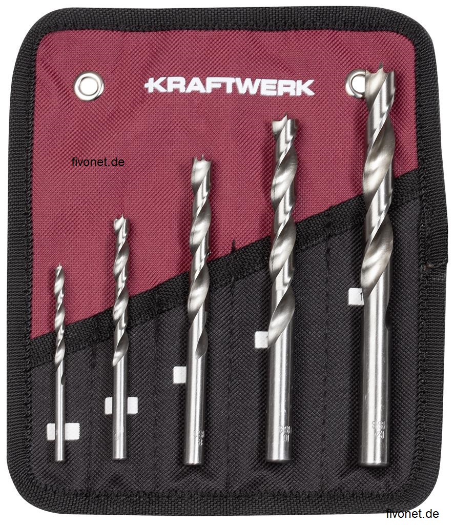 5-tlg. Holz - Spiralbohrer Satz, in Werkstattqualität von Kraftwerk. Zur Aufbewahrung und Transport, befinden sich die Bohrer jeweils in einer wieder verschließbaren Kunststoffhülse zum optimalen Schutz. Diese wiederum sind in der praktischen Rolltasche übersichtlich angeordnet.