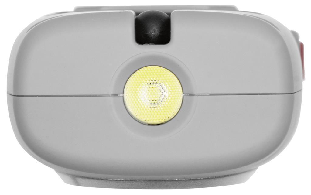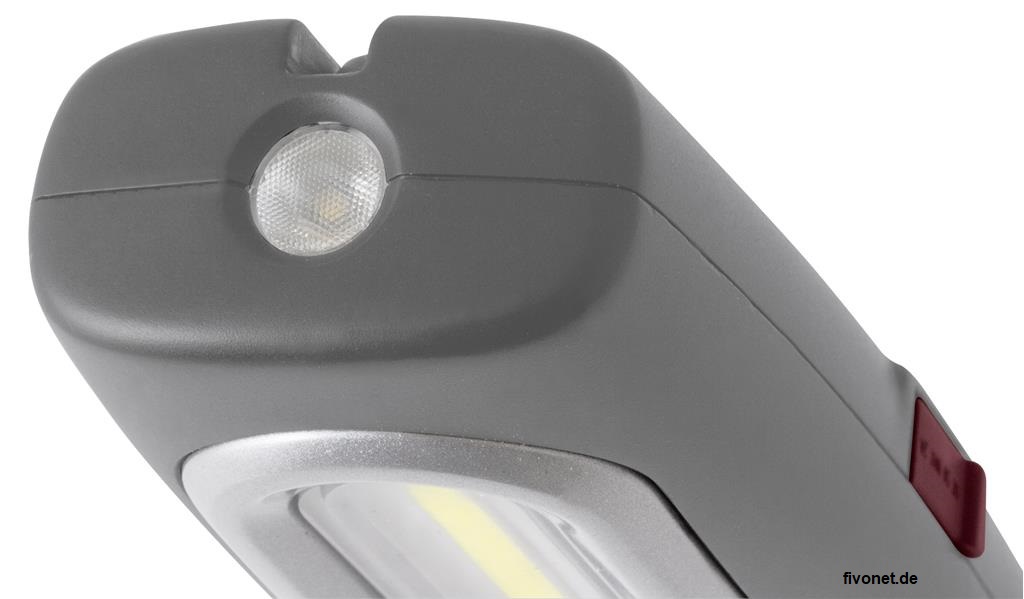 Akku-Handlampe mit Haupt- und Spotlicht sowie neuester COB LED Technik für Profis. Die neueste Generation der Akku-Leuchten strahlt mit dem COB Hauptlicht in einem Abstrahlwinkel von 120 Grad ein extrem helles und gleichmäßiges Licht von 200 Lumen in Stufe 1 und 600 Lumen in Stufe 2. Das 1 Watt SMD Spotlight an der Spitze ist für einen konzentrierten Lichtstrahl mit einer Leistung von 100 Lumen konzipiert. Die kompakte Bauform mit der gummierten Gehäuseoberfläche weist einen praktischen ausklappbaren und drehbaren Haken sowie 1 Magnet auf der Rückseite auf. Der bis 180° schwenkbare Fuß ist an der Unterseite mit einem starken Magnet zur optimalen Positionierung auch in schwierigen Situationen, ausgestattet. Super praktisch natürlich die passende Ladestation mit Magnetfuß, welche hier bei diesem Angebot enthalten ist. Sie kann als Tisch- oder Wand- Ladestation verwendet werden. Die Leuchte lässt sich außerdem auch direkt, ohne Ladestation aufladen. Eine Kontrolleuchte unterhalb des Hauptlichtes zeigt den aktuellen Ladezustand an, rot= wird geladen, grün= fertig geladen.