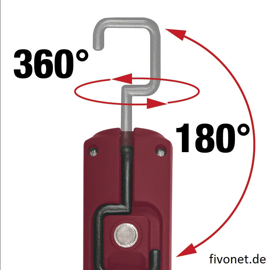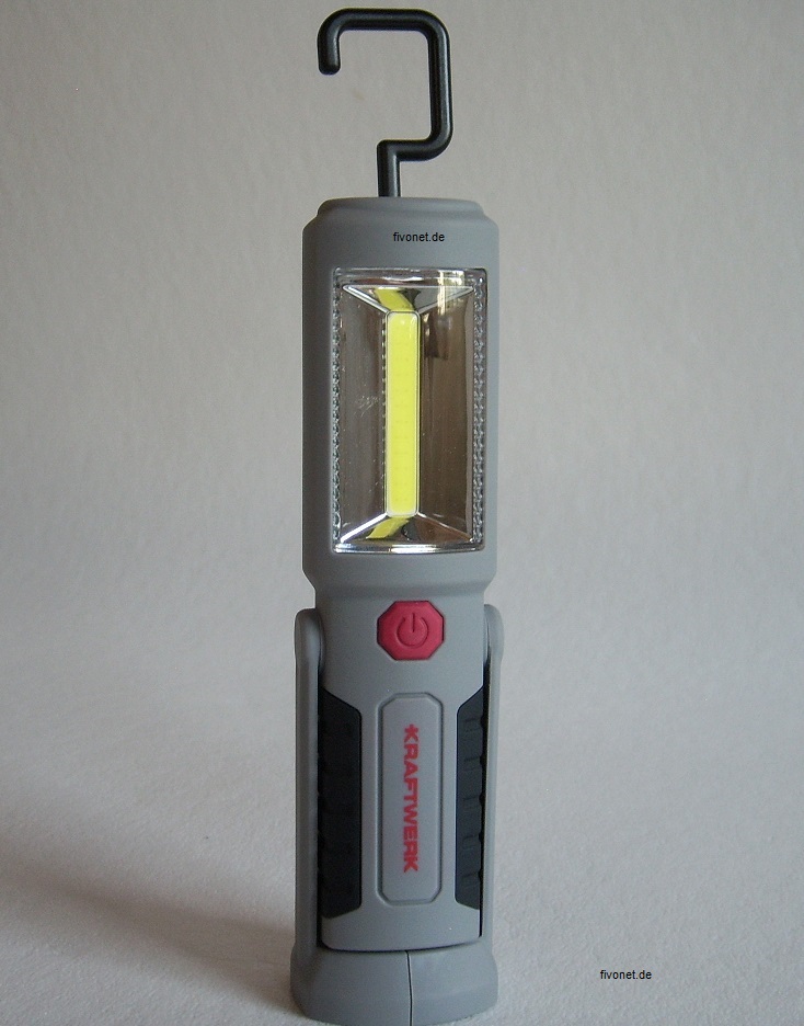 Aufladbare Akku-Handlampe von KRAFTWERK für den professionellen und natürlich auch privaten Anwender. Die kombinierte Arbeitsleuchte kann ein 2W COB Hauptlicht mit einem 120° breiten Abstrahlwinkel, ein 3 LED Spotlight vorweisen. Das robuste Gehäuse ist für vielseitiges Befestigen bzw. Positionieren mit 1 ausklappbaren drehbaren Haken, 1 Magnet auf der Rückseite und einem an der Unterseite des bis zu 270° drehbaren Fuß, ausgestattet. Die Aufladung erfolgt über ein Micro-USB Ladekabel mit USB - Stecker, z.Bsp. am Laptop, PC, oder USB -Netzadapter. Ein Ladegerät ist nicht enthalten. Eine Kontrollleuchte neben der Micro USB Ladebuchse an der Unterseite, zeigt den aktuellen Ladevorgang an, rot= wird geladen, grün= fertig geladen. Im fivonet.de Test hielten wir eine knapp 18cm kleine und 105 Gramm leichte Arbeitsleuchte, mit griffigem Gehäuse und mehreren Befestigungsmöglichkeiten, in der Hand. Beim ersten Druck auf den Schaltknopf, wird das extrem helle und breit abstrahlende Hauptlicht aktiviert. Beim nächsten Schaltvorgang wird das Taschenlampenlicht an der Spitze eingeschaltet. Fazit: Kleine praktische wiederaufladbare Handlampe mit extrem starken Hauptlicht.fivonet.de Text