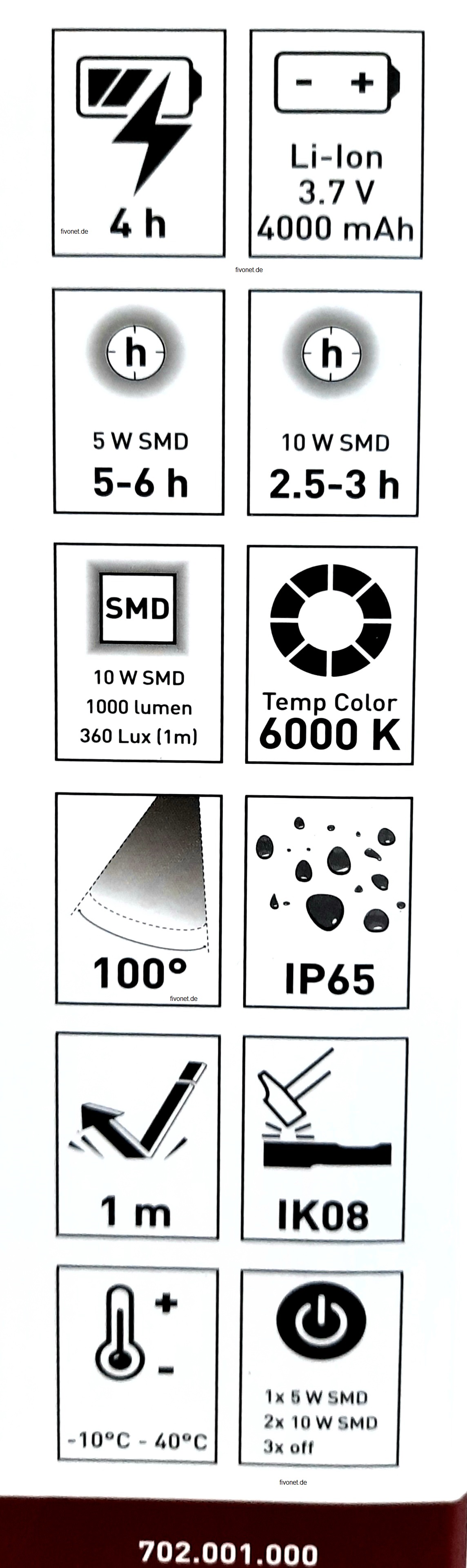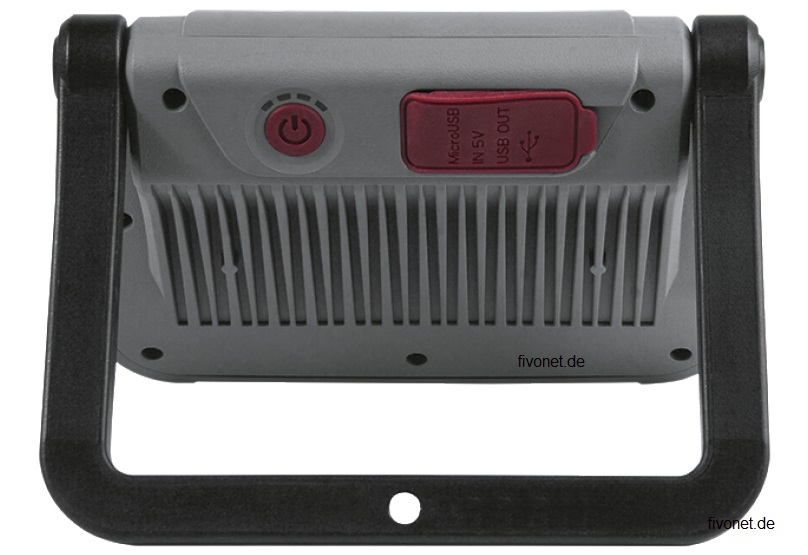 Die wiederaufladbare LED Arbeitsleuchte T1000 von KRAFTWERK, strahlt wahlweise in 2 Stufen mit 500 bzw. 1000 Lumen ein extrem helles räumlich gleichmäßiges, diffuses Licht in einem Abstrahlwinkel von 100°. Das aus schlagfestem Kunststoff bestehende Gehäuse ist äußerst robust. Die kleine handliche nur 400 g leichte, mit einem 3,7V / 4000 mAh Li-Ion Akku betriebene Lampe, ist mit einer speziellen Plexiglasplatte ausgestattet und produziert trotz der starken Leuchtkraft ein nahezu blendfreies diffuses Licht gegenüber anderen LED Strahlern. Ein praktischer Bügel, dient zur optimalen Positionierung oder zum Tragen als Griff. Zum Aufladen der Profi-Leuchte T1000 am Netzadapter, PC, Laptop usw. ist ein USB Ladekabel enthalten. Ein Netzteil / Ladegerät ist nicht im Liefrumfang enthalten. Ebenso wie die Ladebuchse, befindet sich auf der Rückseite ein USB - Ausgang der Powerbank, zum Aufladen von mobilen Einheiten. Per Knopfdruck wird der aktuelle Akkustand angezeigt. fivonet.de Text