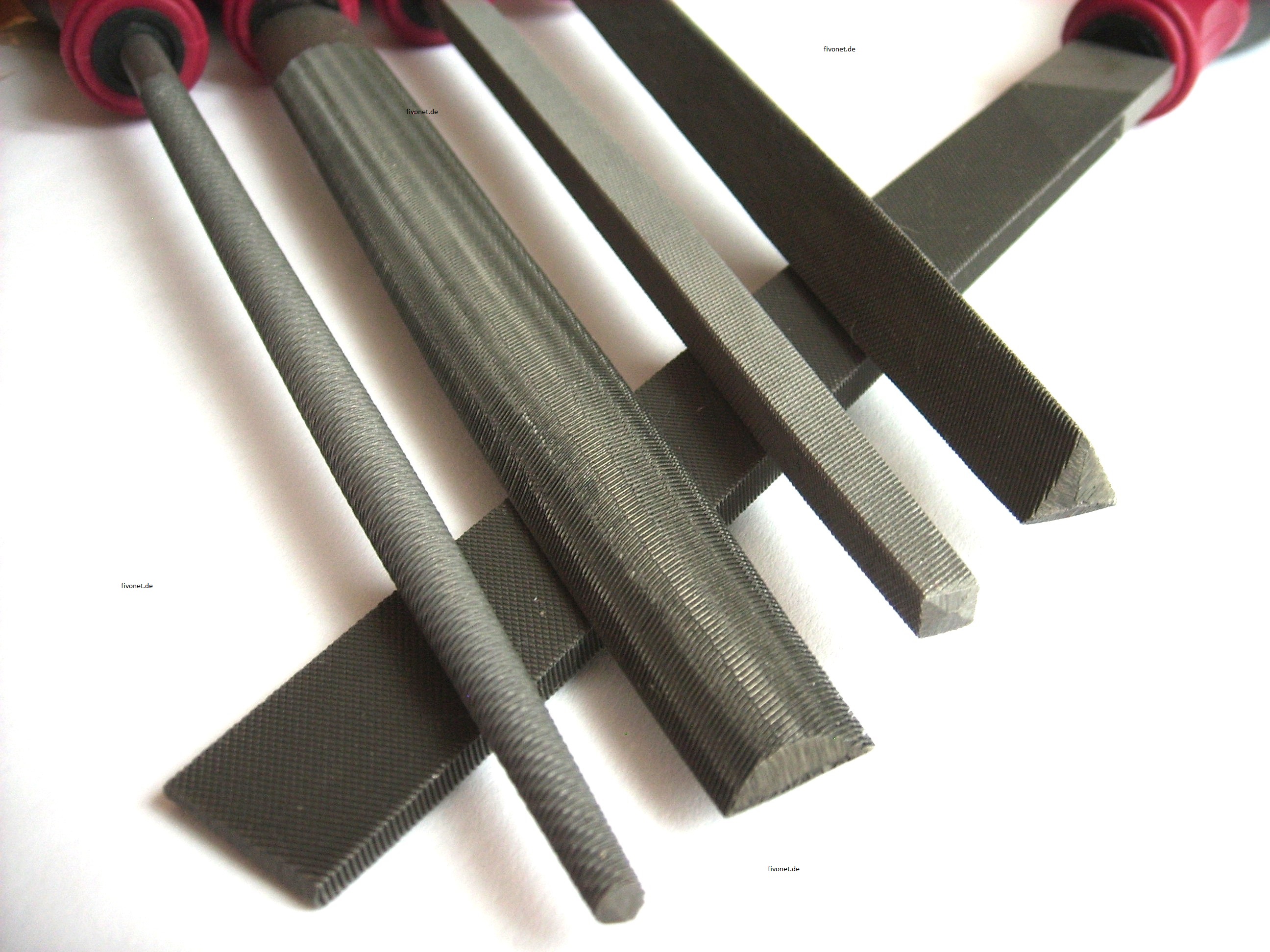 Profi - Feilenset halbschlicht mit Zweikomponenten-Handgriffen für sicheren Halt beim feilen. Das Werkzeug hat jeweils eine Gesamtlänge von ca. 32cm, wobei die Feile ca. 20cm und der Griff ca. 12cm lang ist. Der Handgriff ist perfekt gefertigt und kann eine leichte Vertiefung für Daumen und eine gummierartige Komponente für festen Halt in der Hand - auch bei längeren Arbeitsgängen - vorweisen. Die Feilen sind aus CrV in absoluter Werkstattqualität. Das Set besteht aus 5 verschiedenen Feilen: Flachfeile, Halbrundfeile, Rundfeile, Vierkantfeile und Dreikantfeile. fivonet.de Text