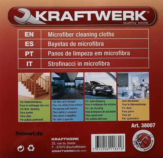 4 Mikrofaser Putztücher von KRAFTWERK, in 4 verschiedenen Strukturen und Farben für viele Anwendungsbereiche.