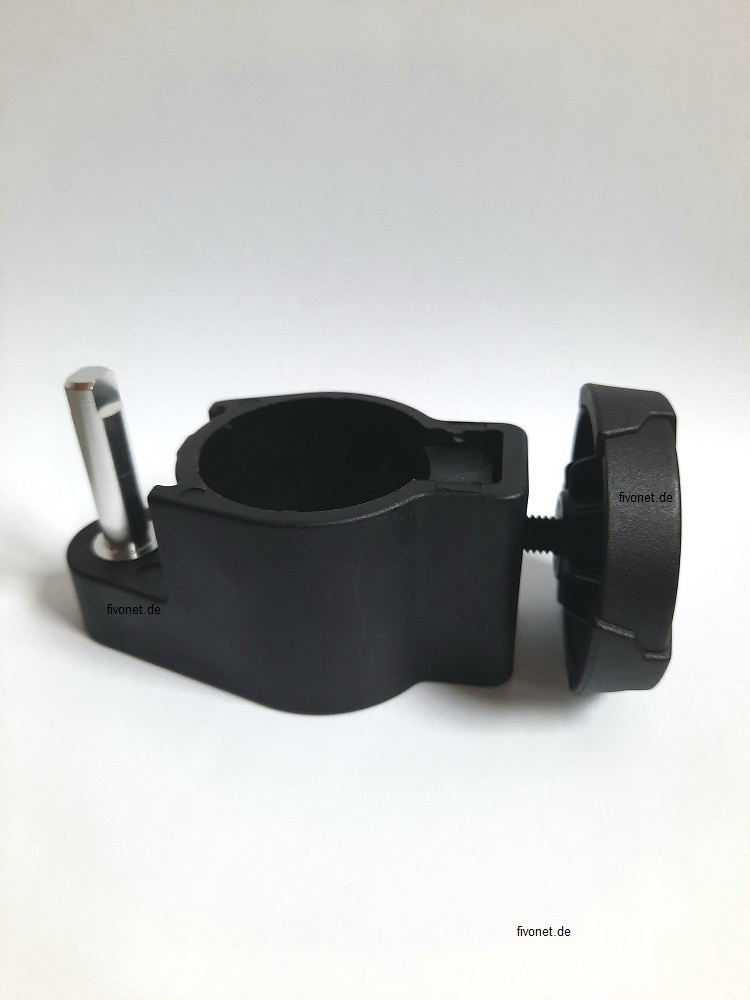fivonet.de Text. Super praktisches Scangrip Zubehörteil / Halterung, zur Positionierung von Scangrip Arbeitsleuchten mit Bügel, am unteren Stativrohr von Scangrip Stativen. Dazu die untere Klemmverschraubung des Stativs lösen (Innen-Sechskant) und das obere Rohr heraus ziehen. Dann einfach den neuen Klemmhalter einsetzen, oberes Rohr aufstecken, Klemmhalter fest ziehen - Fertig. Nun kann die Höhe für die untere Arbeitsleuchte bequem eingestellt werden. Der neue Halter funktioniert, ebenso wie die der Stativrohre, mit Klemmtechnik. Die Halterung ist für das Rollstativ Wheelstand / 5 Räder entwickelt, passt jedoch genauso für das untere Rohr beim Vorgänger - Rollstativ sowie beim Tripod von Scangrip. fivonet.de.