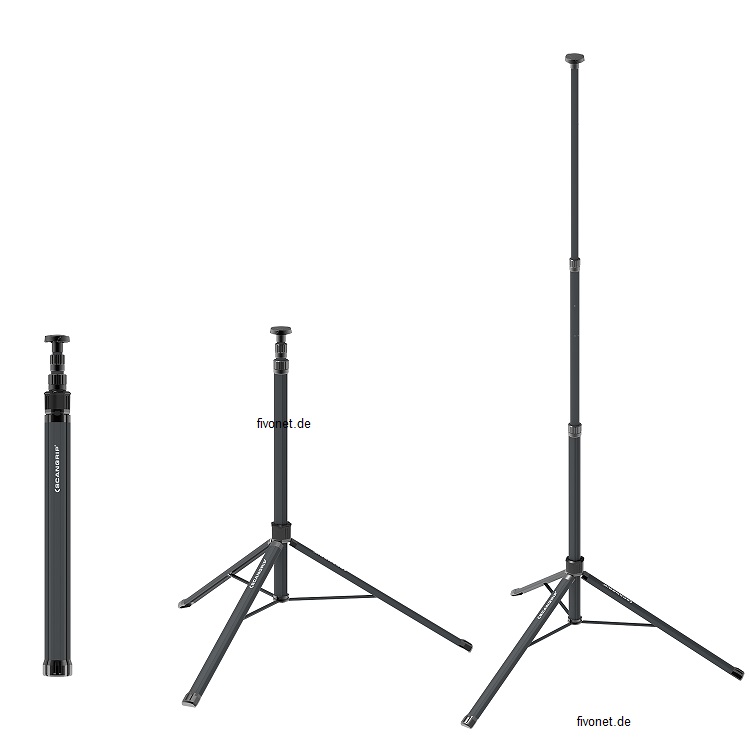 fivonet.de - Funktionsbeschreibung: Das wirklich handliche Stativ lässt sich spielend leicht aufstellen. Dazu den Push Knopf an der Unterseite drücken und schon lassen sich die 3 Beine gleichzeitig ausfahren. Jetzt kann die Lampe mit dem Gewindehandrad auf dem oberen Stativrohr befestigt werden. Nun mittels dem jeweiligen Feststell - Drehgriff die Stativrohre ausfahren und die gewünschte Höhe einstellen, Fertig! Superschneller Auf- und Abbau garantiert!