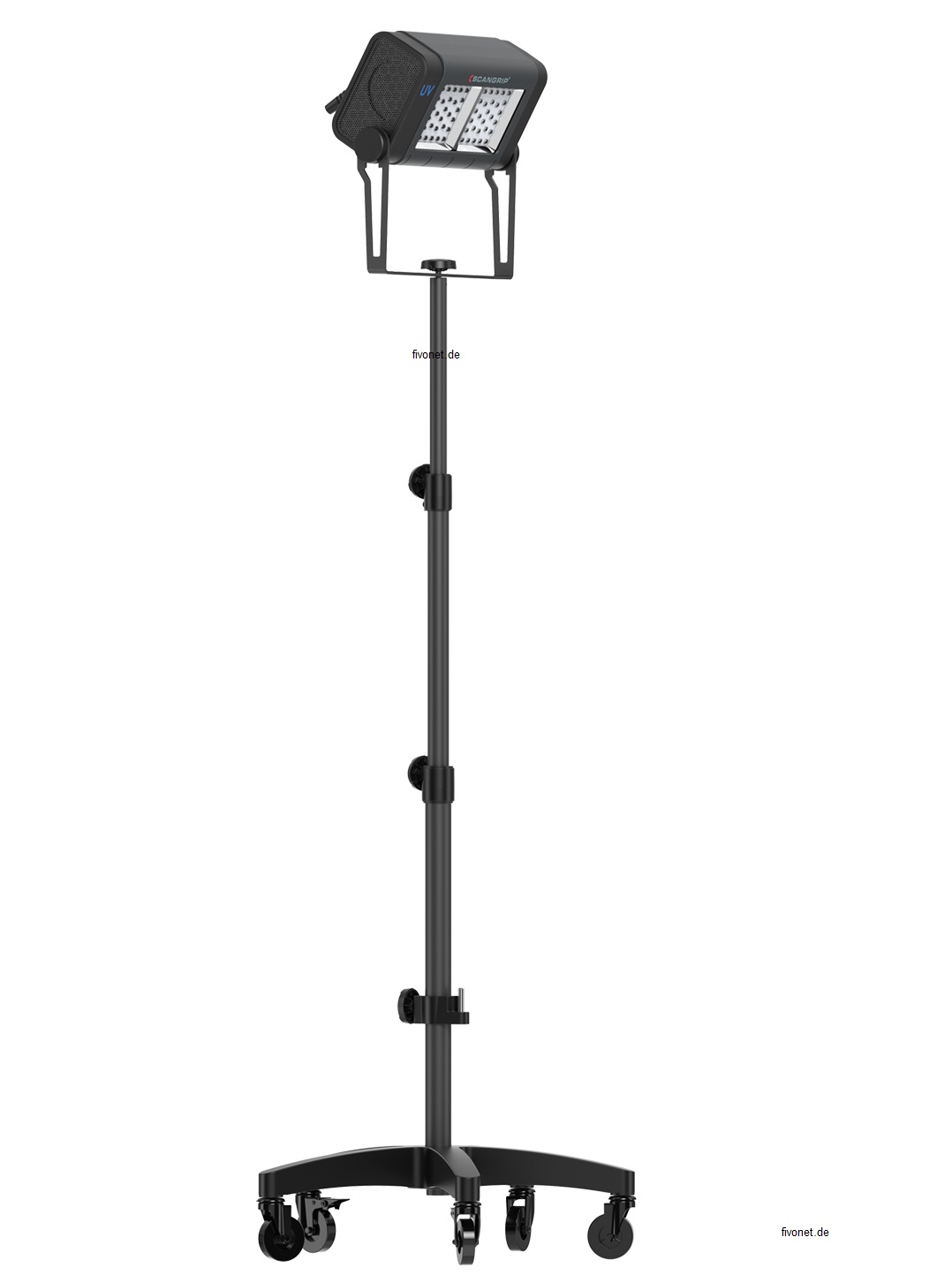 Scangrip Rollstativ in verbesserter Ausführung jetzt mit 5 Rädern. Das fahrbare Stativ ist von 0,9 - 1,9 Meter verstellbar und lässt sich hervorragend bewegen. 2 der 5 Räder sind feststellbar. Die Stativrohre bestehen aus kräftigem, pulverbeschichtetem Stahl, das Unterteil ist aus einem stabilen Kunststoff hergestellt. Der Aufbau beansprucht ca. 3 Minuten und geht relativ einfach. Zuerst die 5 Räder in das Sternunterteil stecken. Anschließend das stärkste Rohr mit dem Konus nach unten einstecken. Jetzt die neu entwickelte Halterung, welche zur Aufnahme einer Arbeitsleuchte in Verbindung mit dem speziellen Beschlag im unteren Bereich gedacht ist, aufstecken. Danach die beiden Rohre mit den Klemmhaltern nach unten zusammenfügen und diese jeweils mit einem 5mm Sechskantschlüssel (nicht im Lieferumfang enthalten) fest ziehen, Fertig. Dann kann schon die Arbeitsleuchte (nicht im Angebot enthalten) montiert werden. Einfach Bügel aufklappen und mit der im Lieferumfang enthaltenen Feststellschraube mit Handrad auf das oberer Ende des Stativrohrs schrauben. Eine Arbeitsleuchte (nicht im Angebot enthalten) kann im unteren Bereich einfach mit dem Bügel bzw. der angeschraubten Halterung für UV Extreme, auf die Vorrichtung gesetzt werden. Abschließend noch die jeweilige Höhe für die Beleuchtungen einstellen, nun kann optimale Leistung bei optimalen Lichtverhältnissen erzielt werden. fivonet.deText