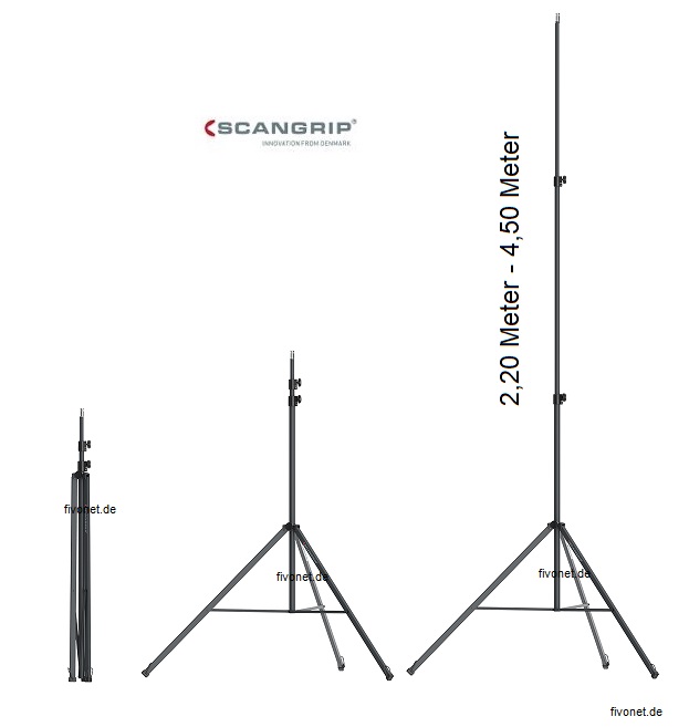 Das luftgefederte SCANGRIP-Stativ TRIPOD 4,5 m wurde für feste und flexible Positionierung der Scangrip SITE LIGHT-Baustellenstrahler konstruiert. Die Baustrahler bieten extrem helle Ausleuchtung von großen Arbeitsflächen auf der Baustelle.Von 2,2 m bis 4,5 m höhenverstellbar bietet das SCANGRIP-Stativ 4,5 m die Möglichkeit den Beleuchtungswinkel und die Höhe beliebig einzustellen. Nach Montage am Stativ kann die Arbeitsleuchte für den optimalen Beleuchtungswinkel gekippt werden. Das Stativ wird mit einem eingebauten, luftgefederten Sicherheitssystem geliefert, das eine sichere und einfache Anwendung ermöglicht und versehentliches Fallen oder Stürzen beim Heben oder Senken des Stativs verhindert.Das Stativ ist aus kräftigem, pulverbeschichtetem Stahl gefertigt mit 10 mm eingeschweißtem Stahlgewinde und passt für eine DIN14640 Scheinwerferbefestigung mit Aufnahme für Montage an einem Dreifußständer.Dank der robusten Konstruktion des Stativs ist es auch völlig herausgezogen sicher. Das Stativ wird mit Sicherungsbügeln geliefert, die für extra Stabilität sorgen, wenn das Stativ starkem Wind ausgesetzt ist oder auf einer unebenen Oberfläche steht.Doppelhalterung (03.5758) für die Montage von zwei SITE LIGHT-Leuchten ist als Zubehör hier in unserem Shop erhältlich erhältlich.